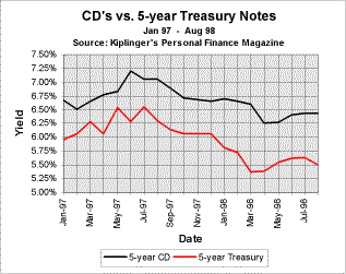 This article was posted on August 1, 1998. While US Treasury securities are easy to buy and commission free through a Treasury Direct account, investors willing to do some leg work can get higher yields from certificates of deposit (CD) with virtually the same US Government guarantee against losing your money. For the past 18 months the highest yielding 5-year CD available has beat a 5-year Treasury note from 37 to 94 basis points according to Kiplinger's Personal Finance magazine. ![]() Kiplinger's data included a nationwide survey of bank CDs with a minimum deposit of $10,000 or less. One point to remember, the data plotted here is for the highest yielding CD in the nation. The yields at your local bank may be less, often less that the yield on a Treasury security of the same maturity. Do FDIC insured CDs have the same government guarantee as Treasury securities? Almost. US Treasury securities are backed by the full faith and credit of the US Government with respect to principal and interest, up to any amount. FDIC insurance only covers accounts up to $100,000 and guarantees return of principal only. It does not guarantee interest payments. During the saving and loan crisis of the 1980's many depositers had to accept lower interest rates on their CDs after their bank failed and the new owners refused to continue to pay the high rate of interest promised by the previous owners. What if I need my money before maturity ? As most people know, CDs have substantial penalties for early withdrawal. Some full service brokerage firm offer CDs and maintain a market in them so that their customers can buy and sell them prior to maturity. Bid/asked spreads in these markets are typically larger than those found in the Treasury market. While these CDs are sometimes advertised as being "commission free", brokered CDs typicaly offer lower yields than those bought directly from the offering bank. The broker has to get his cut of the transaction somehow. A new service of the Treasury Direct program allows you to sell a Treasury security held in the account for a $34 commission. Taking advantage of the lower bid/asked spreads in the Treasury markets may make it cheaper to sell a Treasury security before maturity. Whether you buy CDs or Treasury securities, the best course of action is to create a laddered portfolio to lessen the chance you'll need to sell before maturity. Where can I get information on yields ? You can find the highest yielding CDs in the nation at the Bank Rate Monitor web site. Several publications like Kiplinger's Personal Finance and Money magazine also have information on the highest yielding CDs in the nation, but this data is often several weeks old by the time the magazine is on newsstands. |